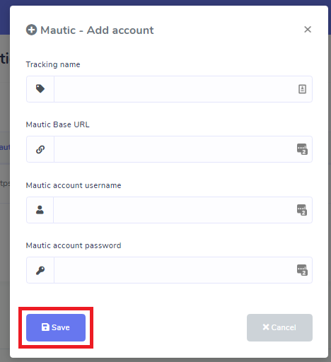 Click the Add Account button. A popup window will appear to put Tracking Name, Mautic Base URL, Mautic account username and Mautic account password. Please provide your Mautic Base URL, Mautic account username, Mautic account password and also give a name so that you can recognize it later.