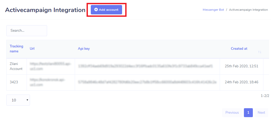 Click the Add Account button. A popup window will appear to put Tracking Name, API URL and API Key. Please provide your ActiveCampaign account’s API URL, API key and also give a name so that you can recognize it later.