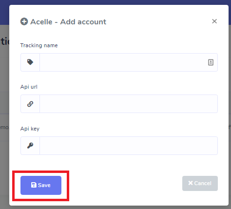 Click the Add Account button. A popup window will appear to put Tracking Name, API URL and API Key. Please provide your Acelle account’s API URL ( example: https://example.com/api/v1 ), API key and also give a name so that you can recognize it later.