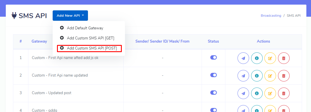 Go to API Channels -> SMS API Section -> HTTP GET/Post option. You'll be redirected to the SMS API management section. Click on the Add SMS API -> Add Custom SMS API [POST] - #Step 2