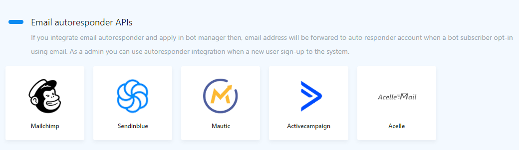 With ChatPion you can collect emails in two ways. One is from when a user sign up into ChatPion system. In order to send user’s sign up email to your corresponding email autoresponder (mailchimp/sendinblue/mautic/acelle/activecampaign) list you need to configure a setting going to the menu System → Settings then click Change Settings from General section. Now click Email Auto Responder tab and select your corresponding email autoresponder (mailchimp/sendinblue/mautic/acelle/activecampaign) list where you want to send the collected email.