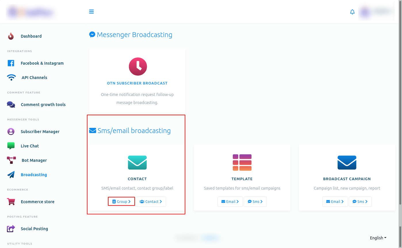 And instantly, will appear a page that is divided into two sections – Messenger Broadcasting and SMS/email Broadcasting. And the SMS/email Broadcasting is divided into three parts — CONTACT, TEMPLATE, and BROADCAST CAMPAIGN.