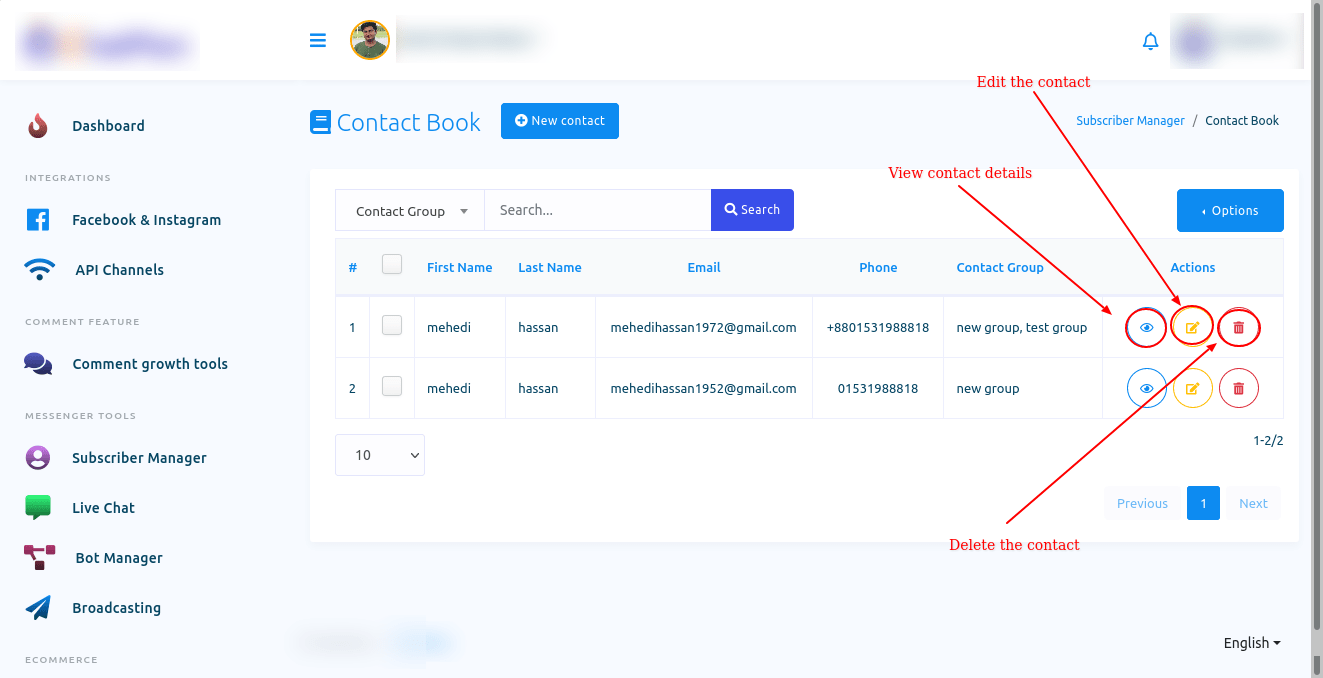 Also, you can see the details of the contact by clicking on the view details(eye icon) button. Just as you click on the eye icon, a modal will appear with contact details.