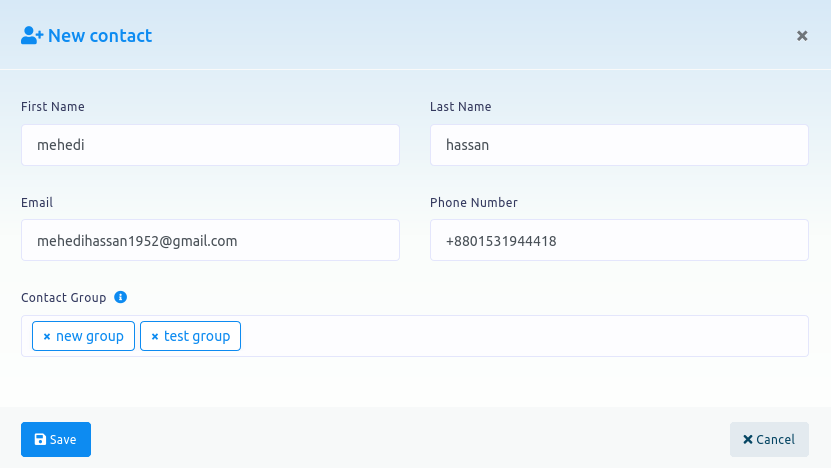 Instantly, a modal form with some fields will appear. Fill-out the form and click on the Save button. And a successful message will appear. And the contacts you create will appear in the list on the Contact Book page.