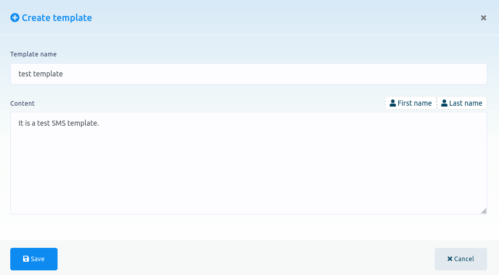 You have to provide a template name in the template name field. Then you have to write content in the content field. You can also include the first name or the last name in the content.