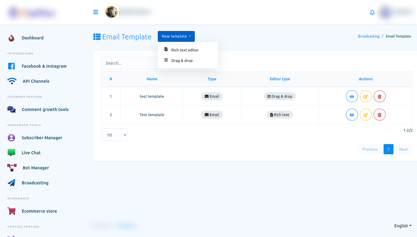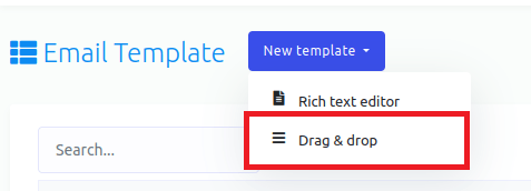 Instantly, a page called email template will appear with a button called new template. Now click on the new template button and a drop-down menu of two options – Rich Text Editor and drag and drop – will appear. Click on the Rich text editor.