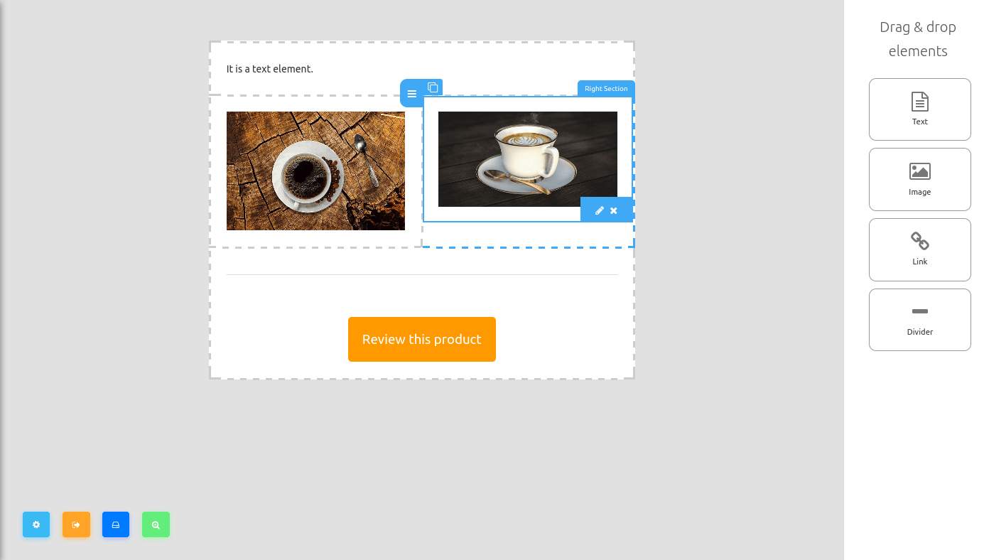With the four types of options, you can create four types of template. Click on any option and an editor will appear. On the right side of the editor, you will see a sidebar with some elements – Text, image, link, and divider. Now you have to drag the element and drop it on the editor.