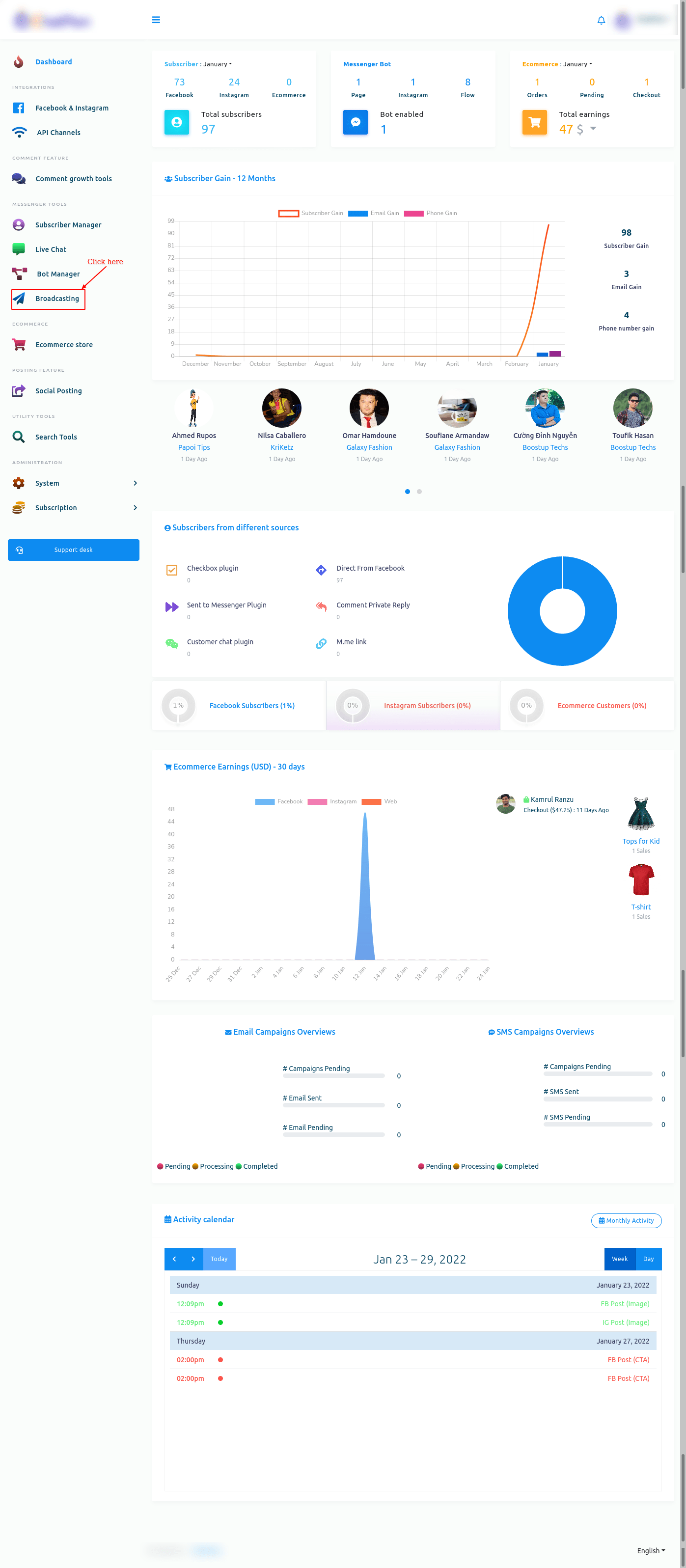 To create a campaign for broadcasting, first, go to the dashboard of ChatPion. Then click on the menu called Broadcasting at the left-sidebar of the dashboard.