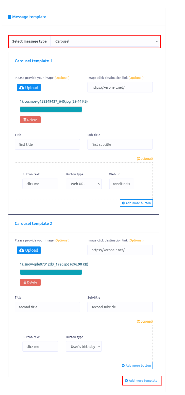If you select carousel as the message type, the same fields as the generic template will appear. Now you have to fill out the fields. Below the fields, you will see add more button and add more template button. If you want to add more buttons click on the button Called Add more button. And if you want to add more templates, click on the button called Add more template button.