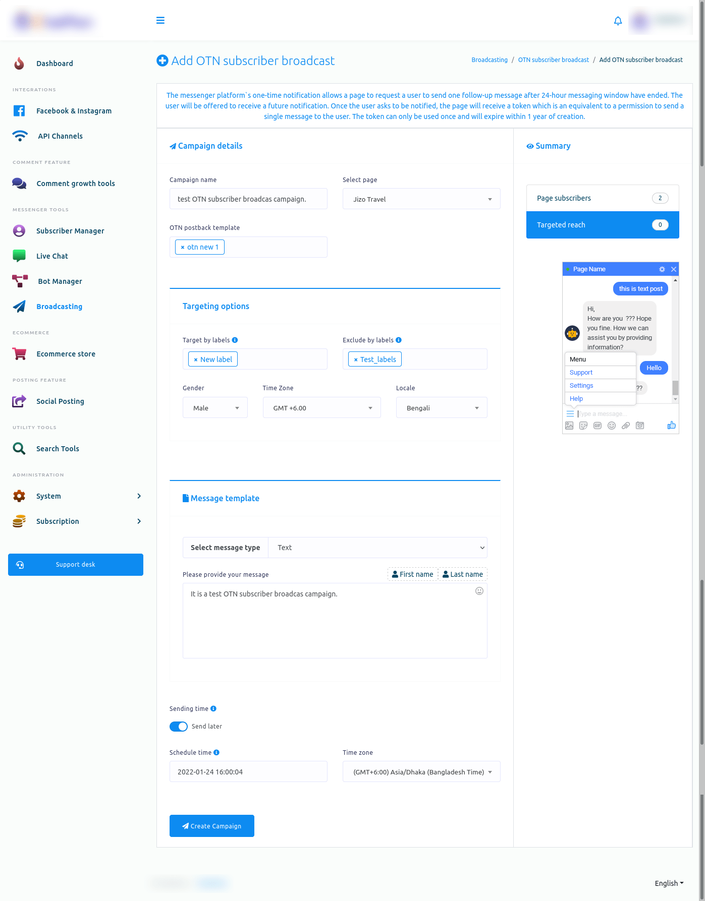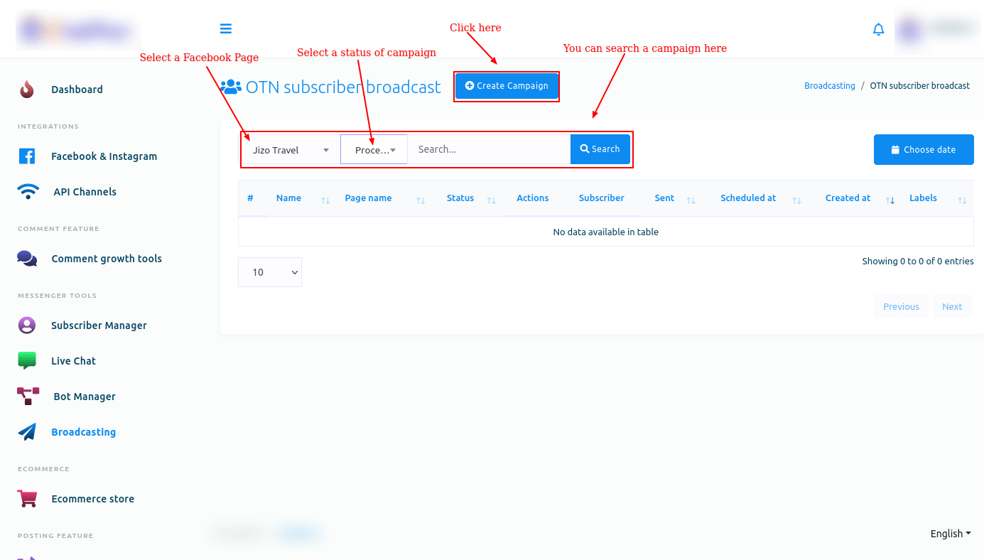 And instantly, a page called OTN subscriber broadcast will appear with a button called create campaign. Now click on the create campaign button.