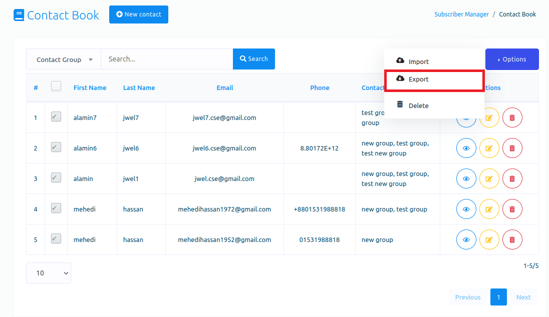 Click on the options button of the Contact book page, and instantly, a drop-down menu of three buttons — import, export, and delete — will appear.