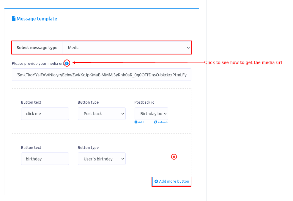 If you select Media as the message type, some fields – media url, button text and button type – will appear. Now you have to fill-out these fields. Click on the tooltip to see how to get the media url.