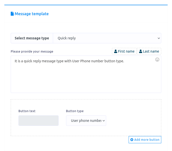 In the quick reply message type, you can select the user phone number as the button type. Just as you select the User phone number as the button type the Button text field will be disabled.