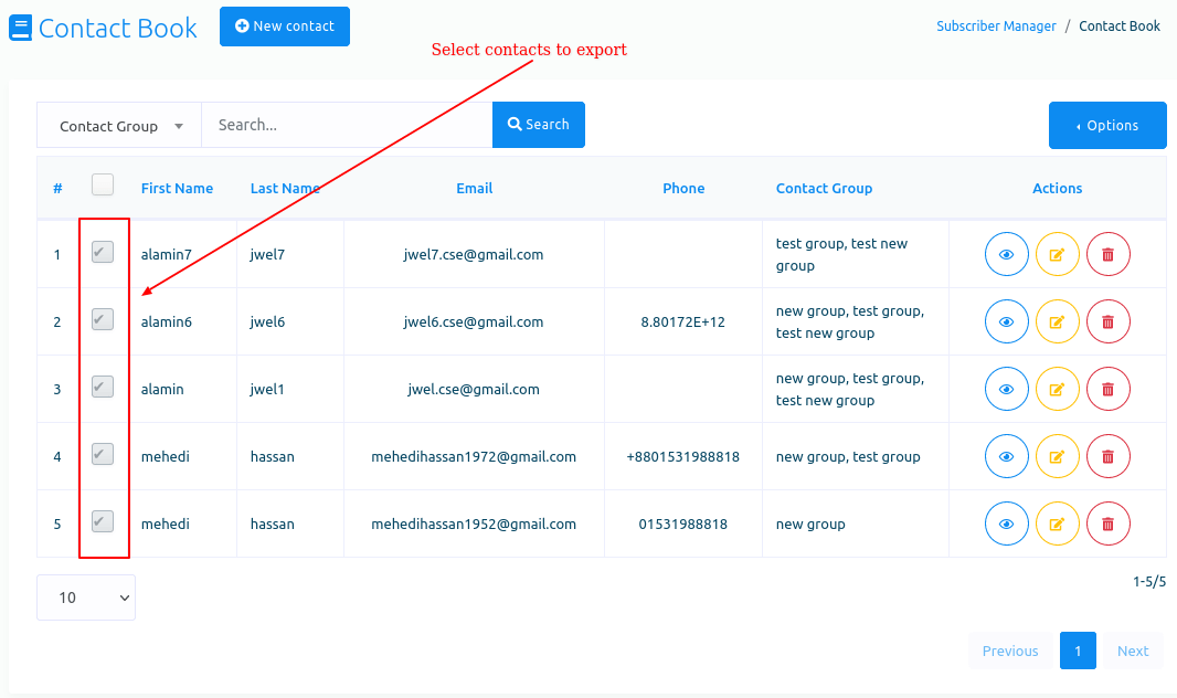 Instantly, a page called Contact Book will appear with a New contact button The predefined contacts will be present on the page. You can edit and delete the predefined contacts by clicking on the edit and delete button. Also, you can see the details of the contact by clicking on the view details(eye icon) button.