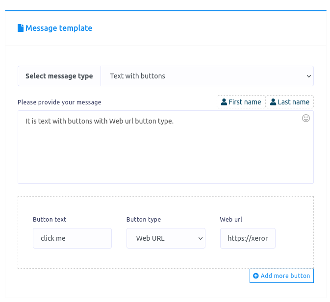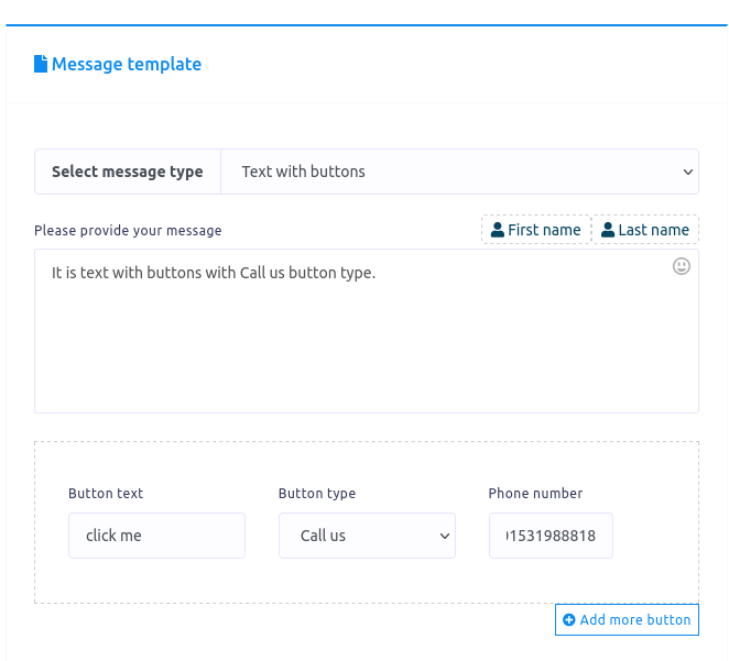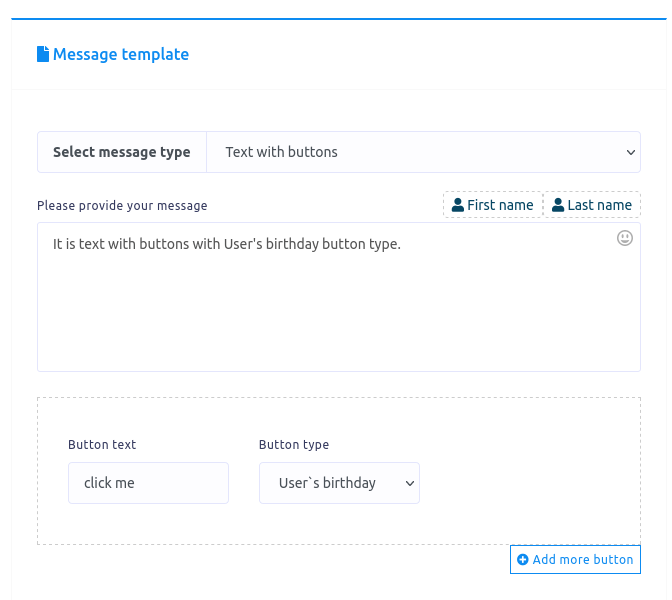 On the other hand, if you select the Text with buttons as a reply type, some fields — Message, Button text and Button type — will appear. Write a message in the message field, write a text for button in the Button text field and select a button type from the button type field.