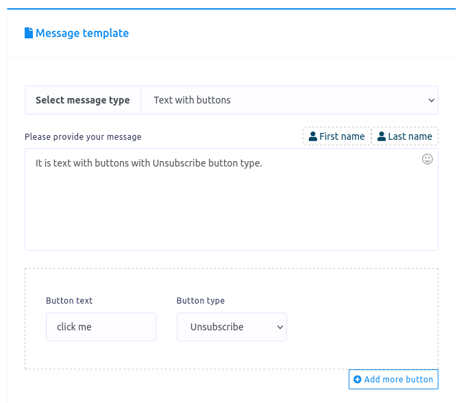 You can also select Unsubscribe button type from the drop-down menu of different button type. When a user clicks on the Unsubscribe button in the messenger, the user will be unsubscribed.