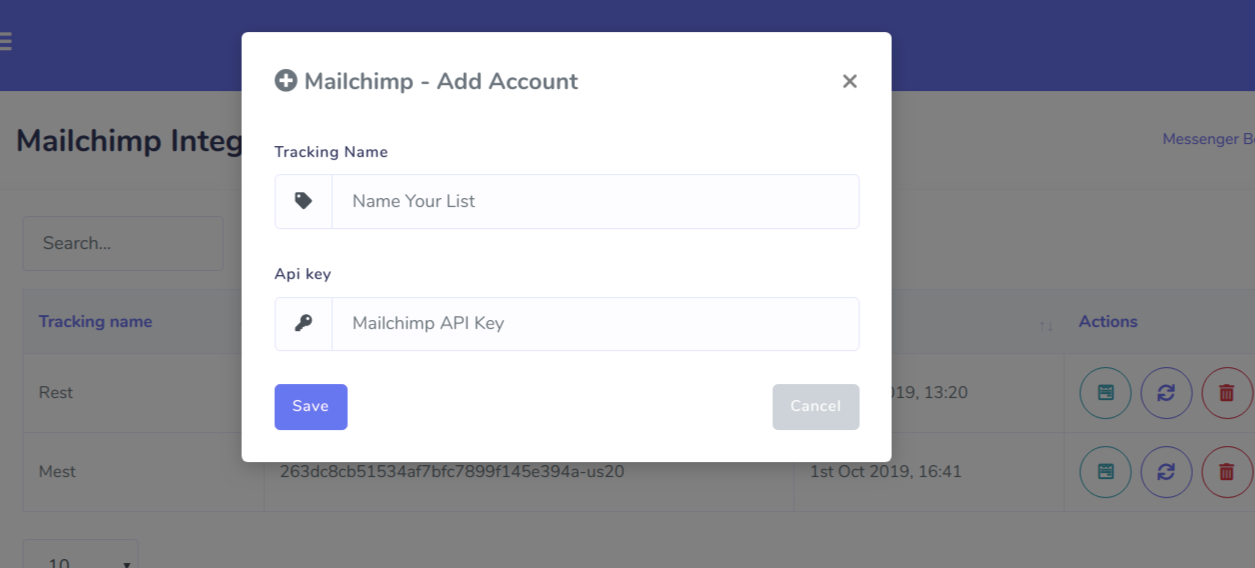 Click the Add Account button. A popup window will appear to put API key and Tracking Name. Please provide your MailChimp account API key and also give a name so that you can recognize it later.