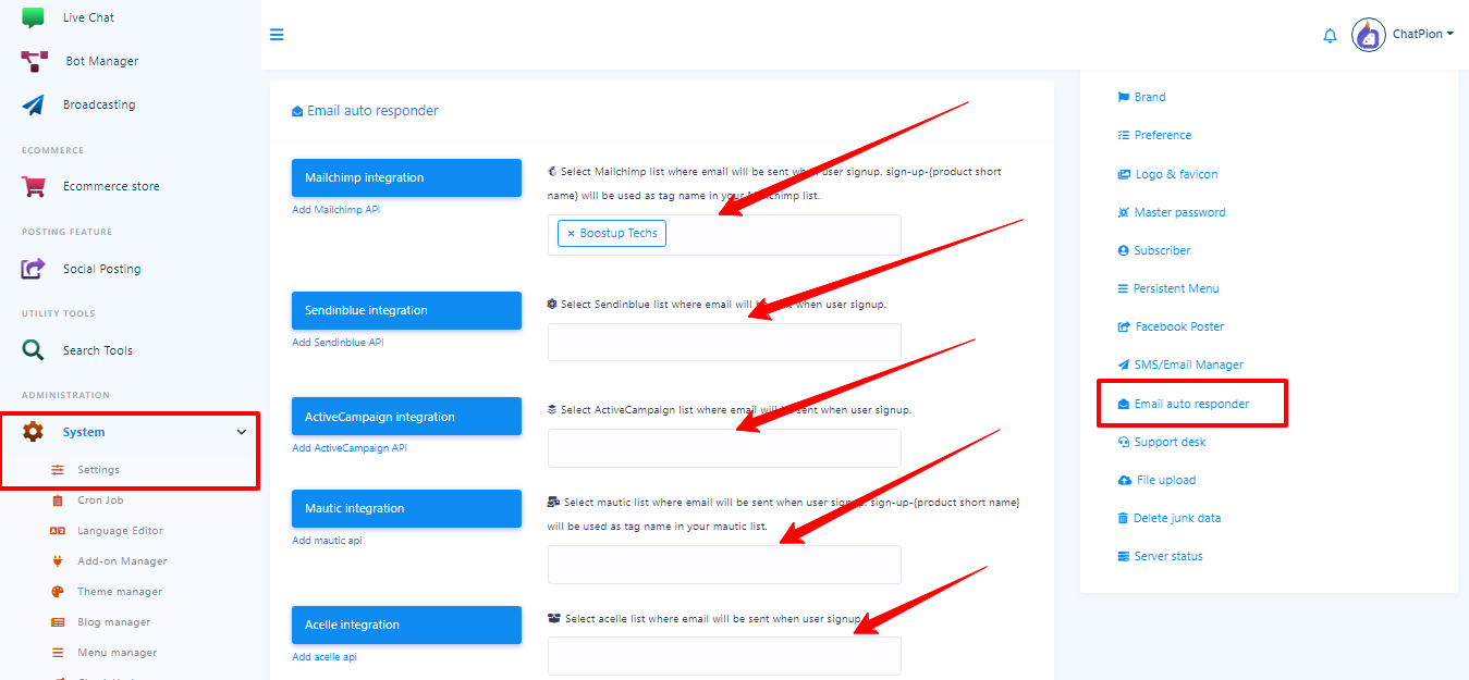 With ChatPion you can collect emails in two ways. One is from when a user sign up into ChatPion system. In order to send user’s sign up email to your corresponding email autoresponder (mailchimp/sendinblue/mautic/acelle/activecampaign) list you need to configure a setting going to the menu System → Settings then click Change Settings from General section. Now click Email Auto Responder tab and select your corresponding email autoresponder (mailchimp/sendinblue/mautic/acelle/activecampaign) list where you want to send the collected email.
