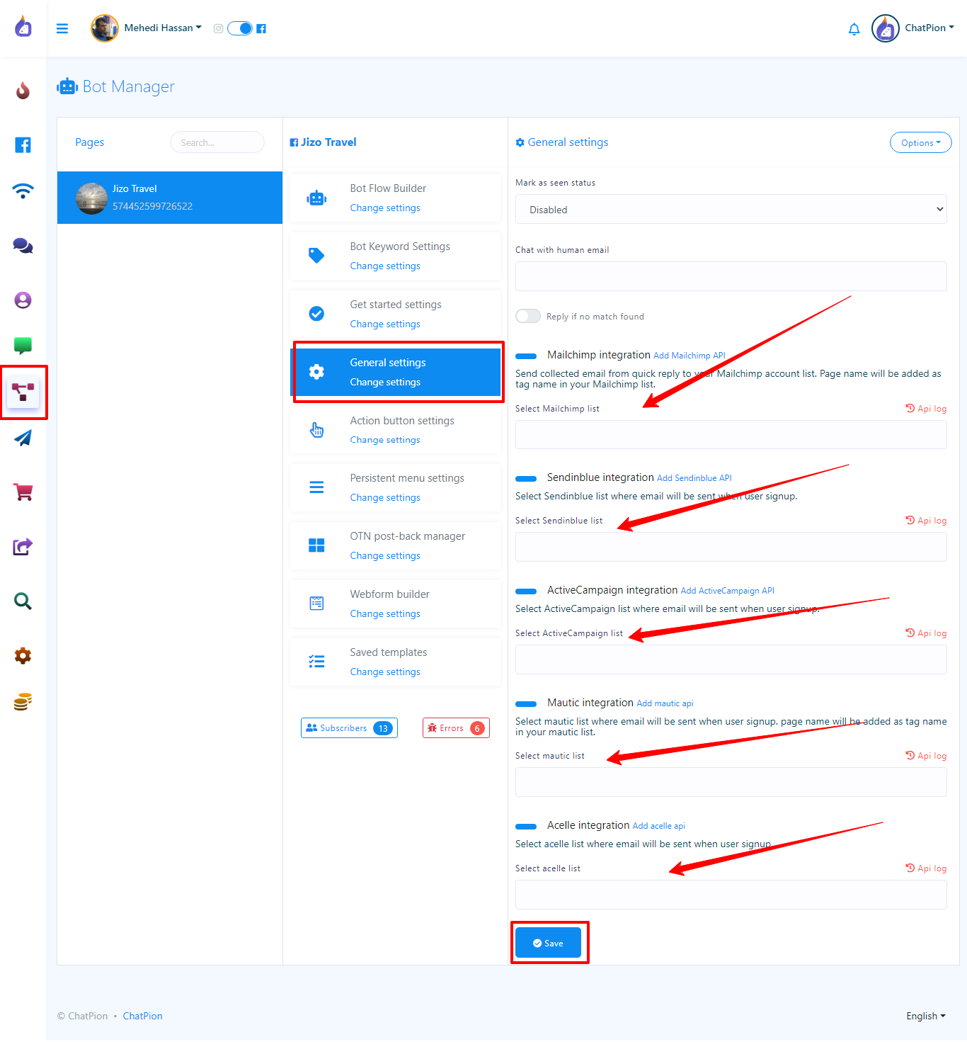 You can now integrate MailChimp into ChatPion. From now with this feature all the emails collected from messenger Quick Reply or user’s sign up will automatically added to your desired MailChimp list.