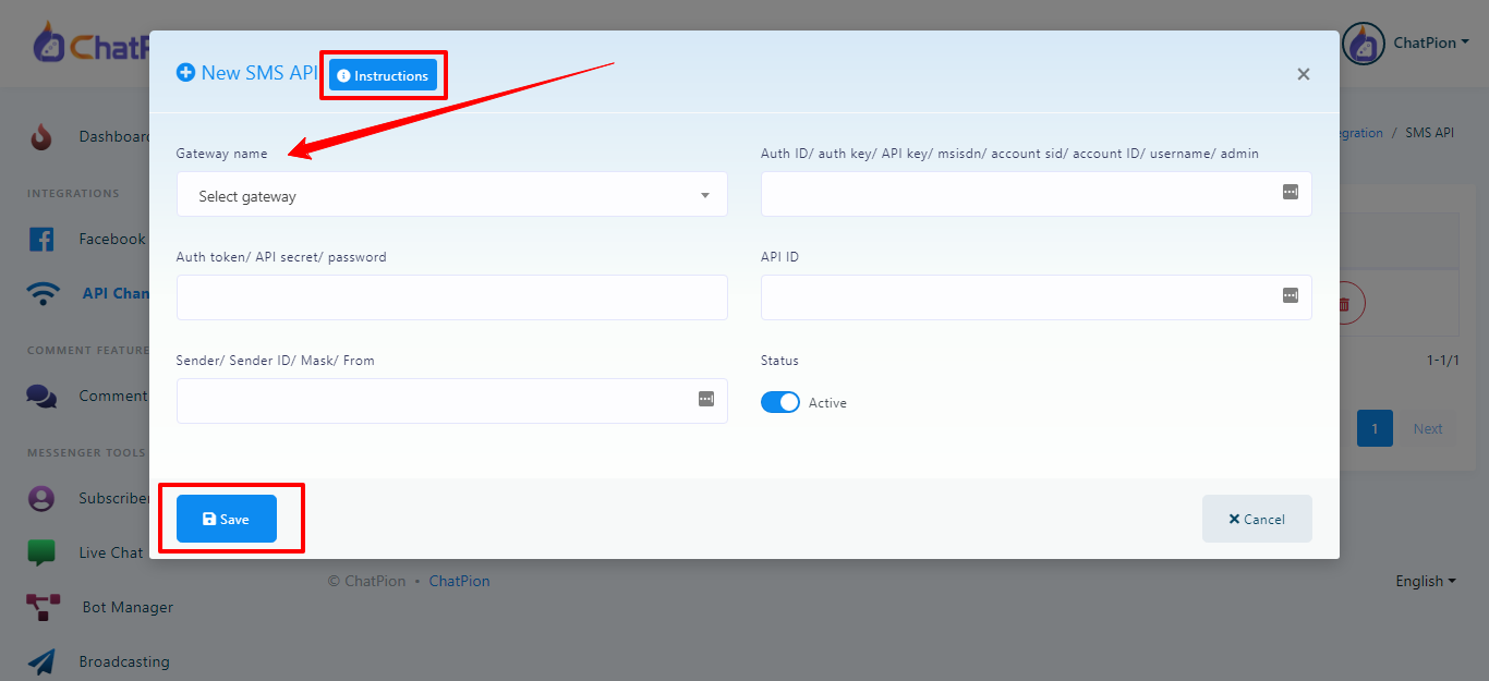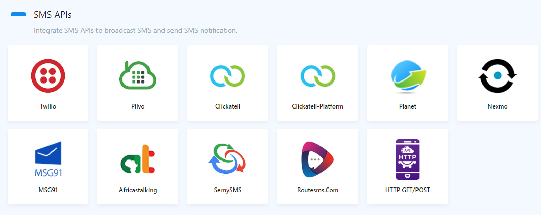 But as a solution we have implemented a system where you can add any HTTP GET Request API for sending SMS. you can use your preferable SMS gateway on Chatpion which supports HTTP GET Request for message sending. Only thing you have to do is to create a custom SMS API using ChatPion. Just follow below steps: