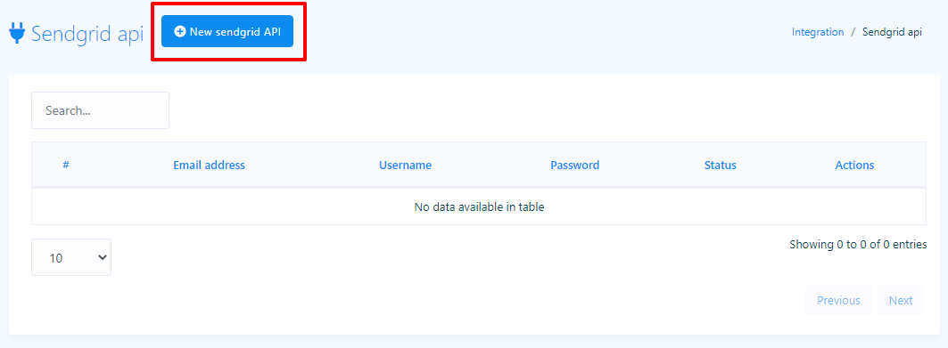Click on New Sendgrid API and a modal will appear to add sendgrid api. Fill up the form with necessary information and hit Save button.