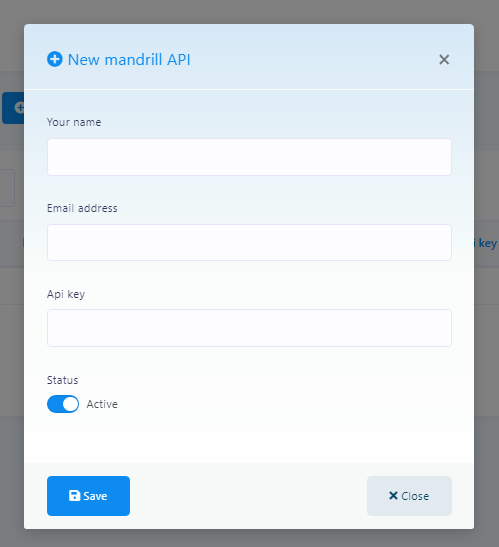 Click on New Mandrill API and a modal will appear to add sendgrid api. Fill up the form with necessary information and hit Save button.