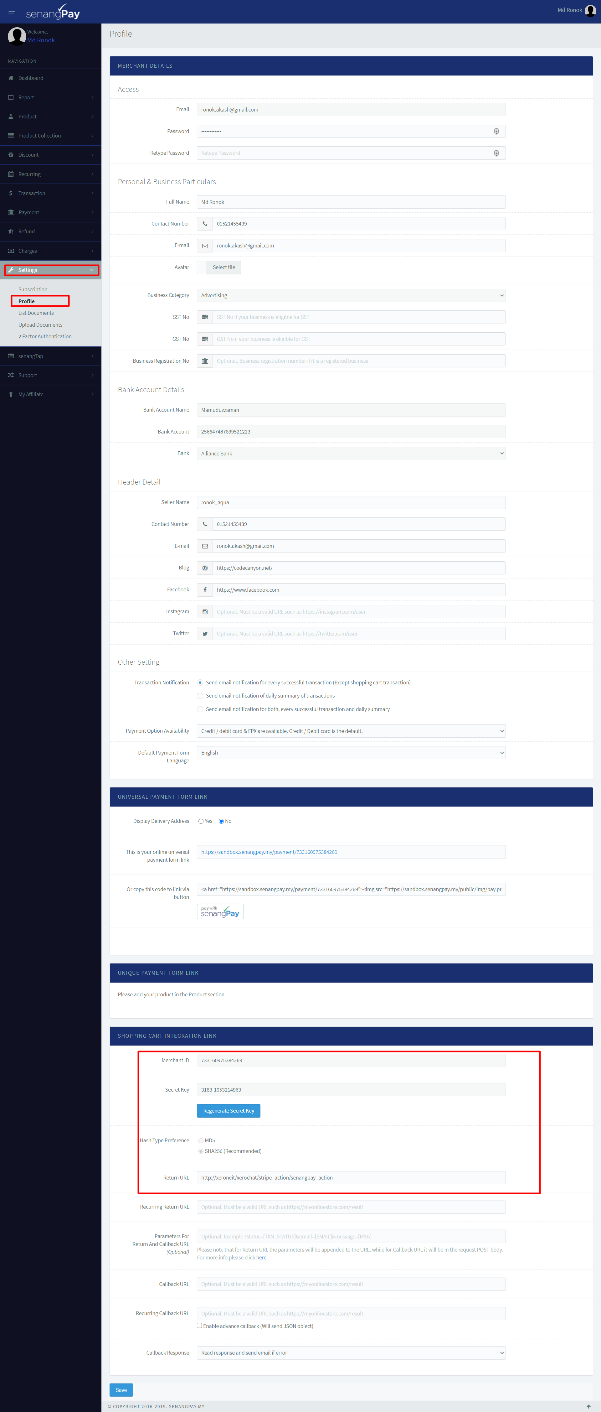 Senangpay merchant id & secret key: If you want to integrate Senangpay payment method then you’ve to put your Senangpay merchant id and secret key. Visit Senangpay and go to Settings > Profile and Scroll down to Shopping cart integration link. From there copy your merchant id and secret key and paste into the corresponding field. Also please copy the Senangpay Return url from Ecommerce store checkout Settings and paste it into Return url of Senangpay panel.