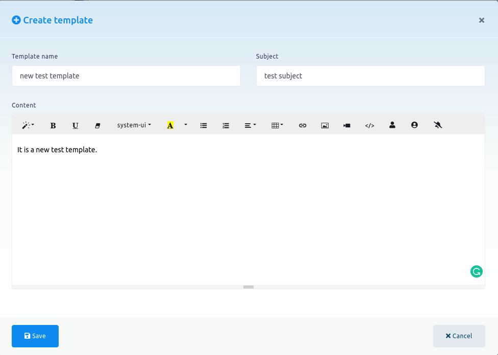Instantly a modal form called create template will appear with some fields – Template name, subject, content. Now you have to give a template name, write a subject in the subject field and write the content of the mail in the content field. Now click on the save button to save the template.