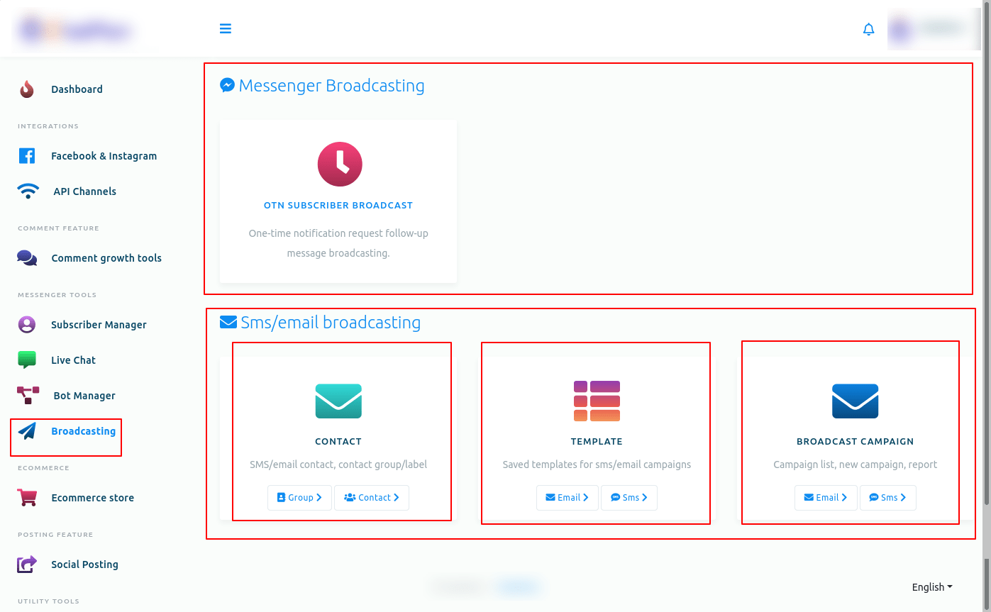 And instantly, will appear a page that is divided into two sections – Messenger Broadcasting and SMS/email Broadcasting. And the SMS/email Broadcasting is divided into three parts — CONTACT, TEMPLATE, and BROADCAST CAMPAIGN.