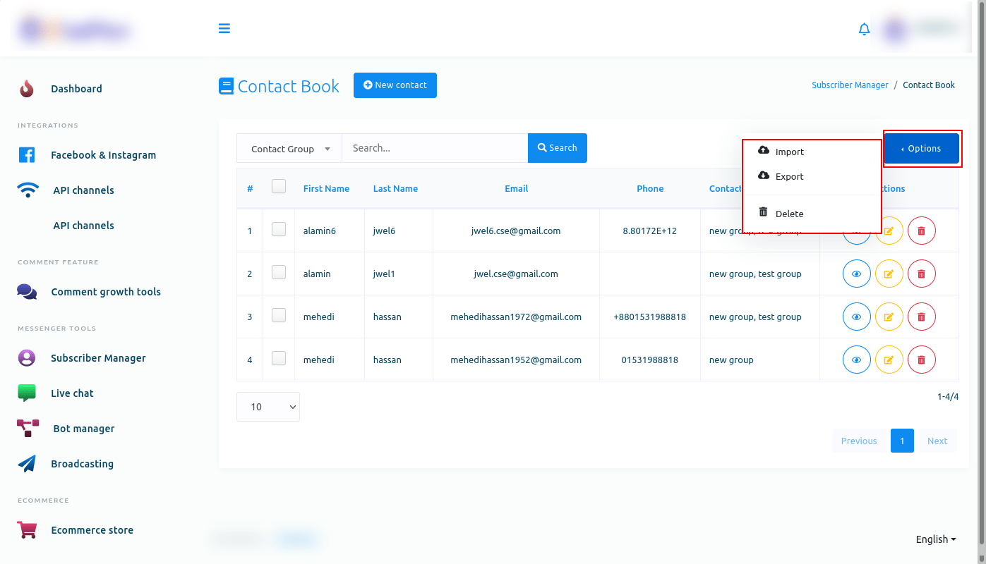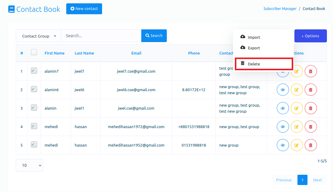 Click on the options button of the Contact book page, and instantly, a drop-down menu of three buttons — import, export, and delete — will appear.
