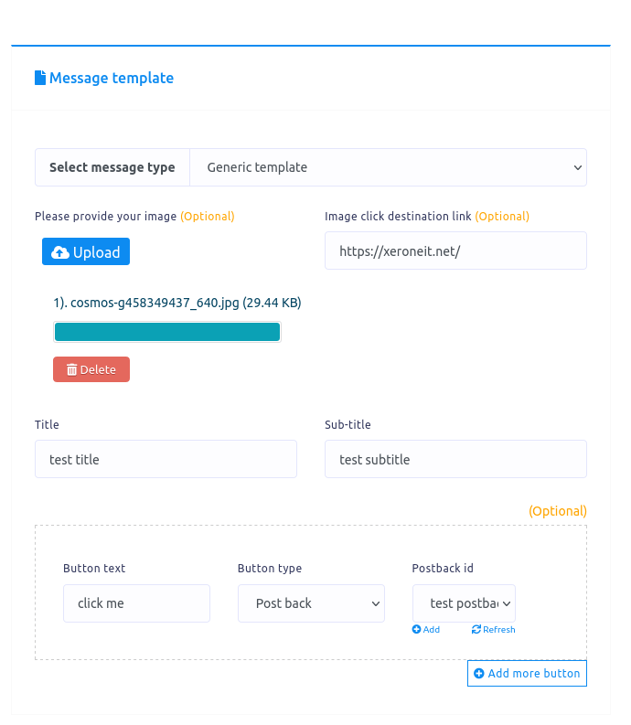 Well, you can also select Generic template as a message type. Just as you select the Generic template, an upload button and some additional fields will appear.