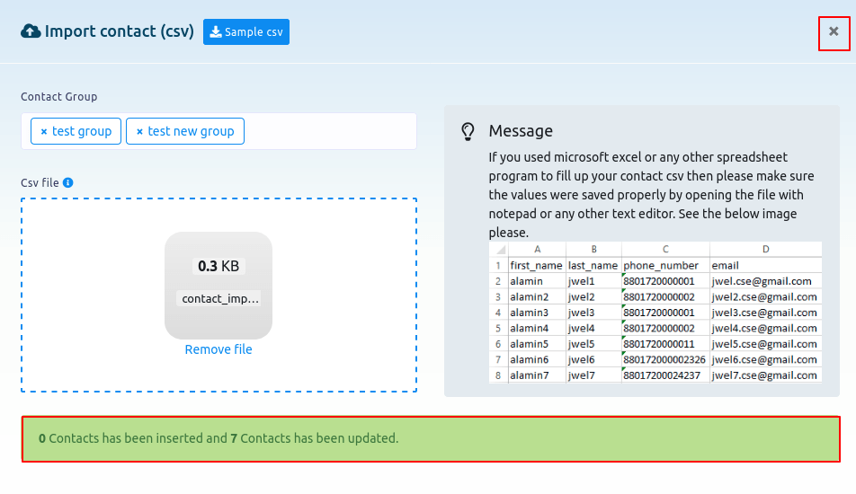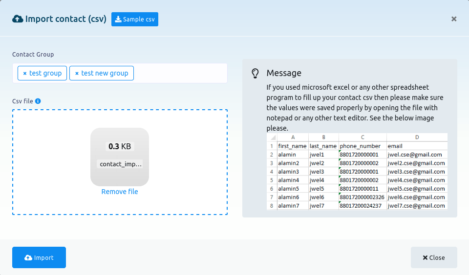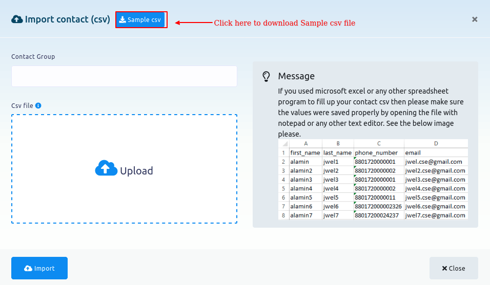 Instantly, a modal form called import contact(CSV) will appear. First, download the sample CSV file to see how to organize the CSV file.
