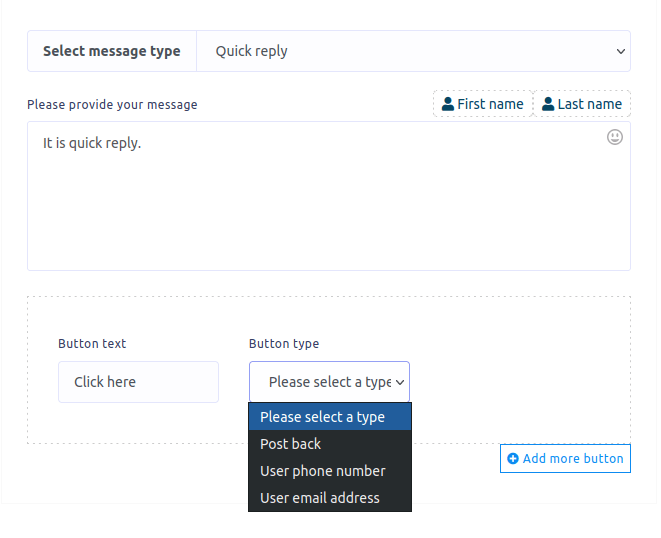On the other hand, if you select quick reply, some fields – message, button text, button type – will appear. Write a text message in the message field, write a text for button in the button text field. Select a button type in the button type field. Click on the button type field and drop-down menu of different button type – Post Back, User phone number, User email address – will appear. From the drop-down menu, select a button type.