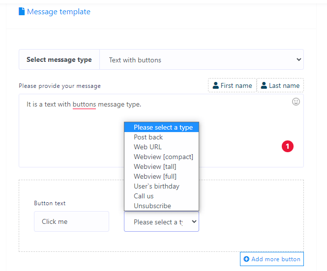 Click on the button type field and a drop-down menu of different button type – postback, weburl, Webview(full), Webview(tall), Webview(compact), User’s birthday, Call us, Unsubscribe – will appear.